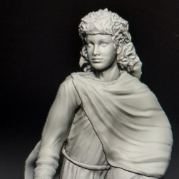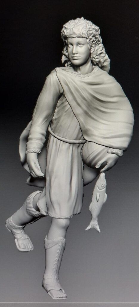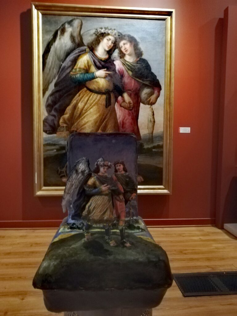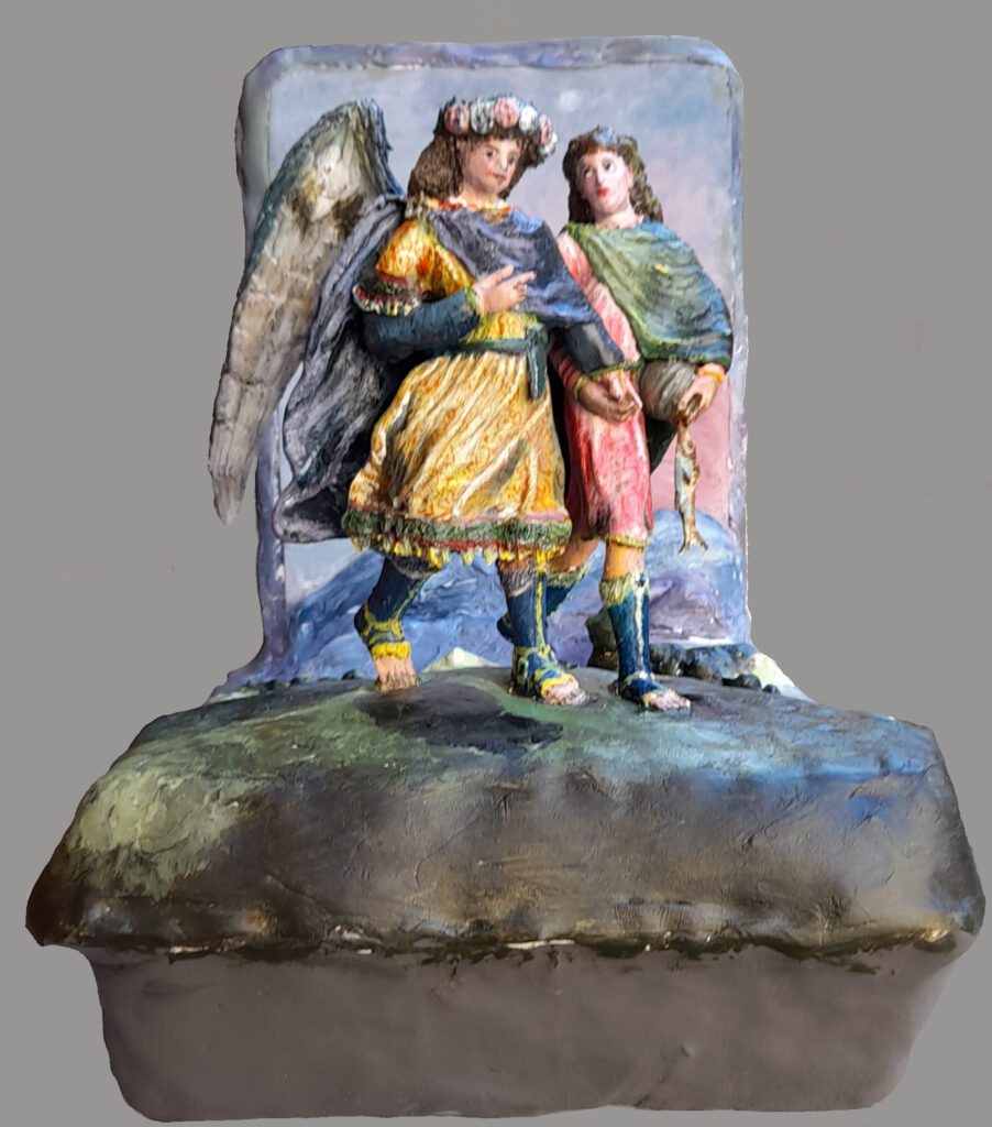 El personaje de la izquierda del cuadro, en primer plano y mirando al exterior, viste túnica corta hasta las rodillas, ceñida a la cintura con un pañuelo verde, de color dorado y bordada con flores, en las mangas y la falda, ambas rematadas con flecos, lleva cenefas verdes con bordados dorados. Porta también una capa de color grisáceo cerrada en el hombro derecho con un broche dorado con pedrería, que oculta parcialmente una gran ala blanca; en el pecho, bajo el cuello, otro broche con una cabeza infantil alada. Calza borceguíes azules con adornos dorados y la cabeza se corona con una guirnalda de flores. El segundo personaje, que vuelve la cabeza para mirarle, viste túnica corta roja ceñida por un cordón a la cintura, capa de color verdoso y borceguíes similares a los del anterior, porta bajo el brazo izquierdo, oculto parcialmente por la capa, un bulto de tela y de la mano cuelga un pez casi transparente en su parte inferior. El paisaje ocupa el tercio inferior del cuadro y el cielo de colores azules y rojizos el resto del fondo. 1628-1647
